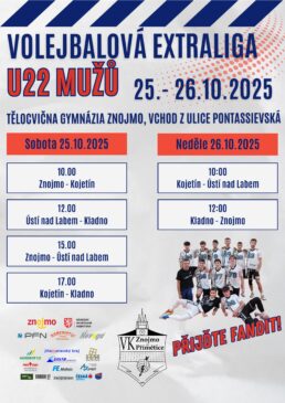 O víkendu 25.-26. října 2025 přivítá Znojmo Extraligů juniorů U22M. Přijďte podpořit znojemské juniory a podívat se na špičkový extraligový volejbal!!!