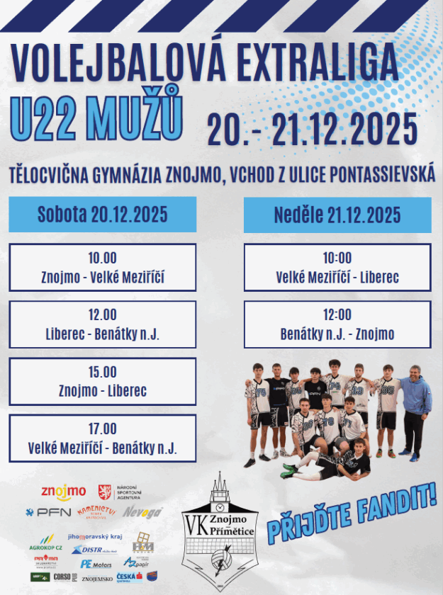 O víkendu 25.-26. října 2025 přivítá Znojmo Extraligů juniorů U22M. Přijďte podpořit znojemské juniory a podívat se na špičkový extraligový volejbal!!!